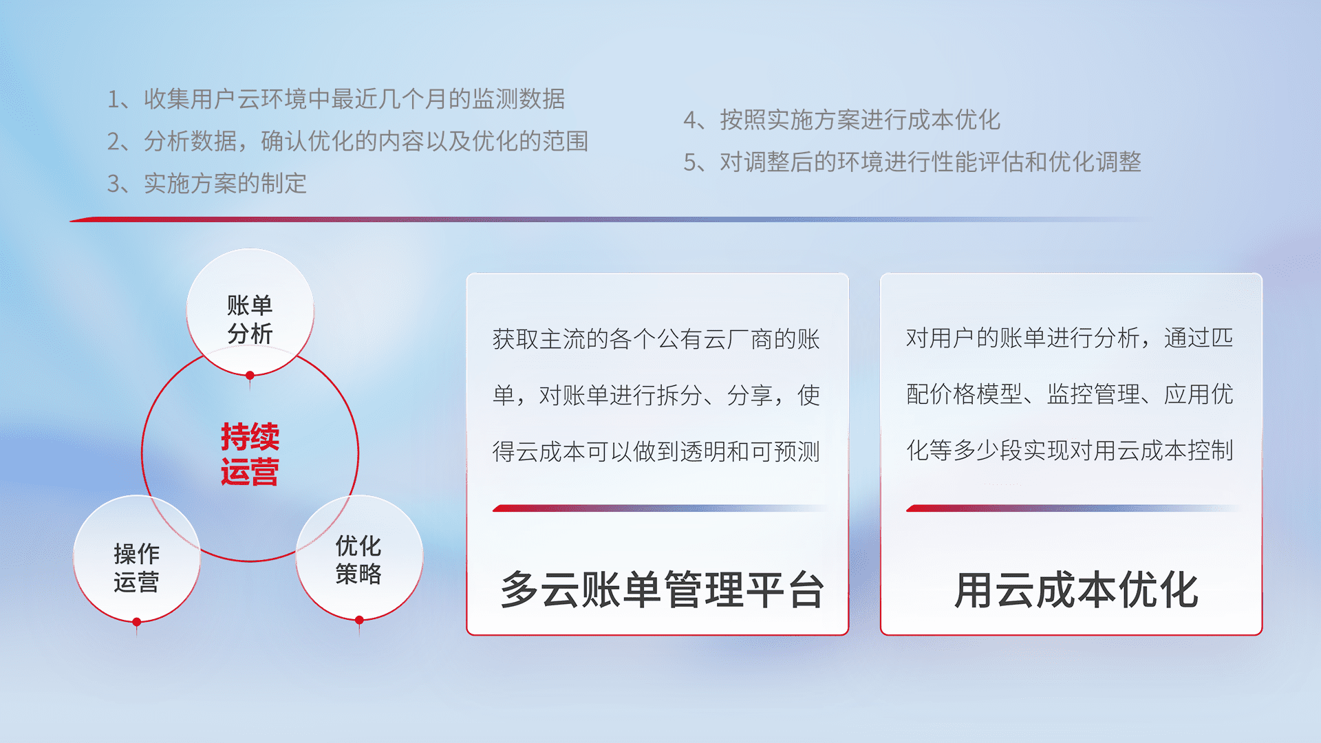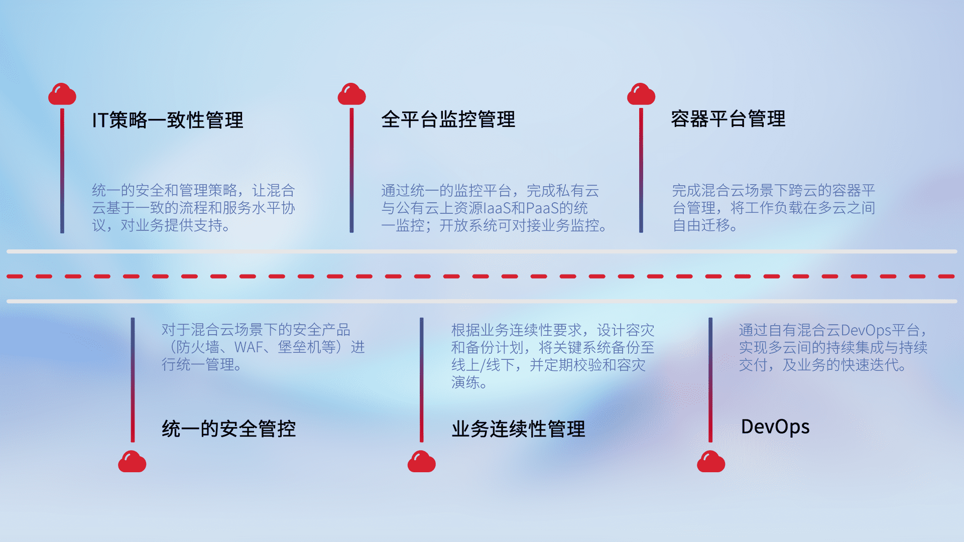 通过多云纳管,,,以统一的资源数据模型把客户的云资源进行抽象和封装,,,进而实现对多云资源的统一操作,,,,保障云资源管理的可靠性、、、稳定性与可用性。。量身定制化运维内容,,配置、、、、开发运维、、、、补丁管理、、、、备份、、、、监控、、、认证和访问管理、、审计和日常巡检等,,保障在用云过程中的可靠度,,稳定度以及高可用率。。