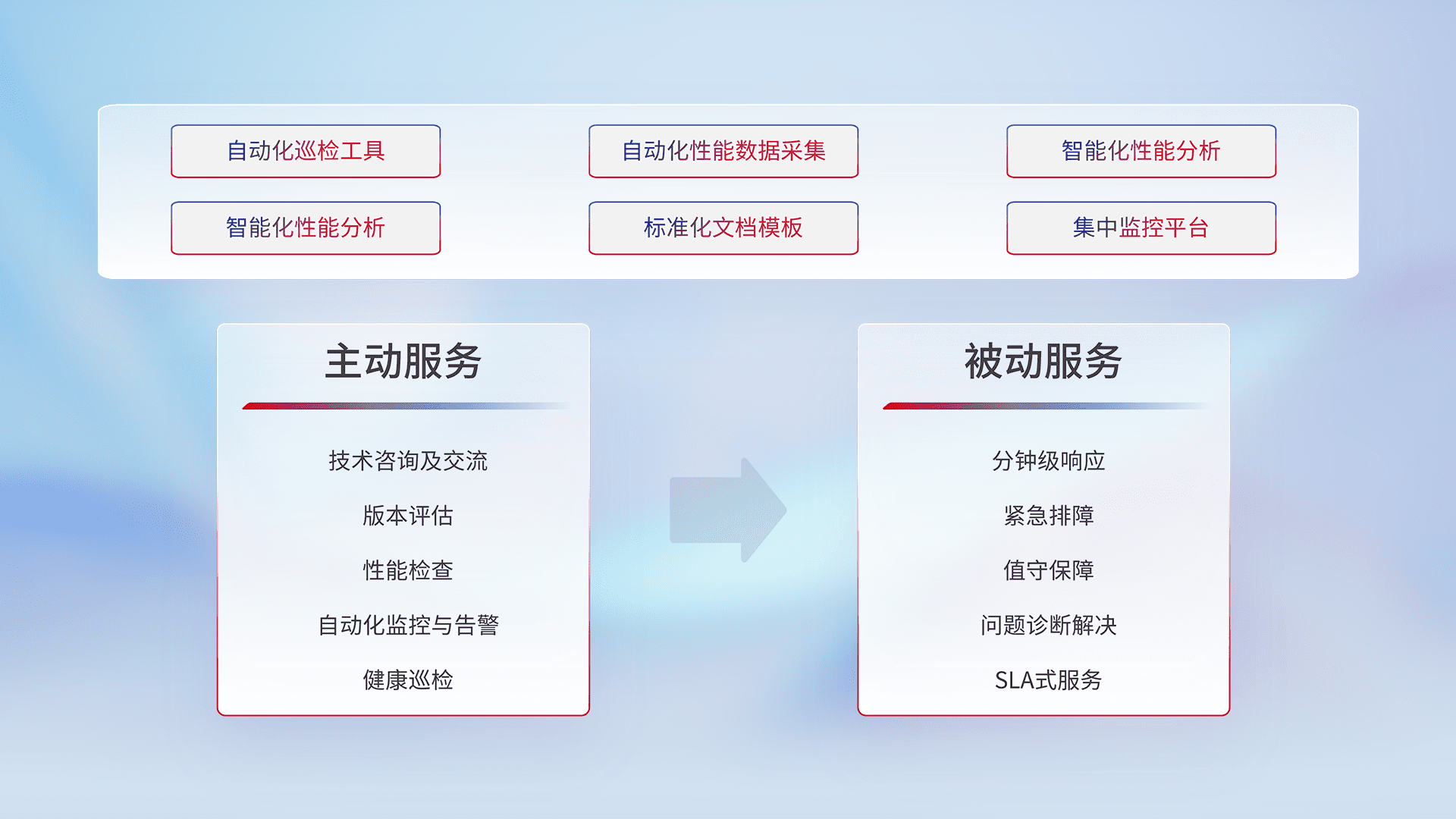 智能化工具和标准化文档,,保障服务质量,,,,提供主动服务(包含技术咨询、、版本评估、、、性能检查、、、自动化监控与告警、、、、健康巡检)和被动服务包含(分钟级响应、、、、紧急排障、、、值守保障、、、、问题诊断解决、、、SLA服务)。。。。