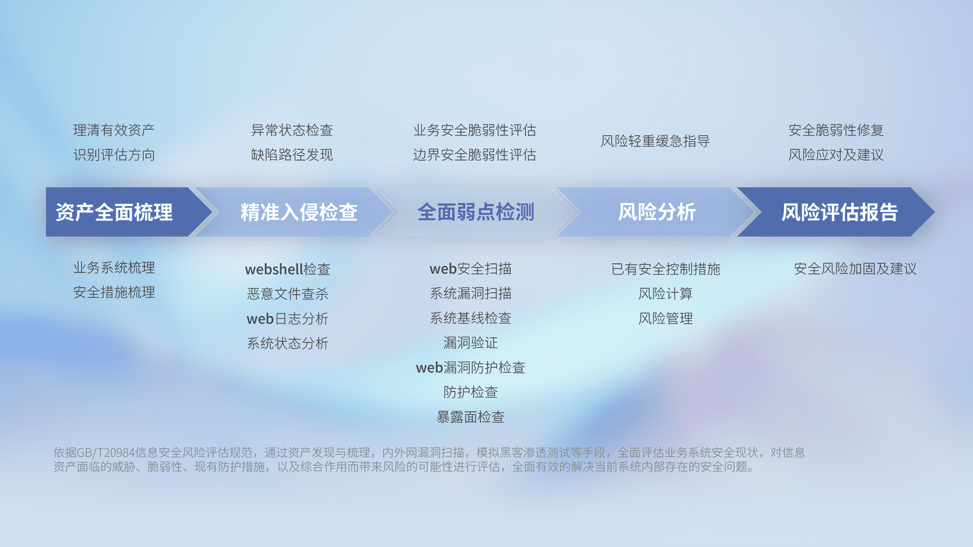 针对客户行业特性,,,,以专业的安全服务+多厂商联合解决方案提供专属的一站式安全管理服务,,,帮助客户全面感知网络空间威胁,,,,基于识别、、、、检测、、、分析、、防护、、、、监测、、、、响应的服务理论模型,,从方案咨询、、、集成交付、、、、评估验证、、、优化加固、、、、运维运营,,致力于为客户提供完整的闭环管理式安全服务。。以实战经验为客户打造高抵御风险的安全体系,,,,帮助客户发现威胁、、对抗威胁、、、、处置威胁,,,,不断积累安全对抗能力,,,持续保障数字化安全。。。。